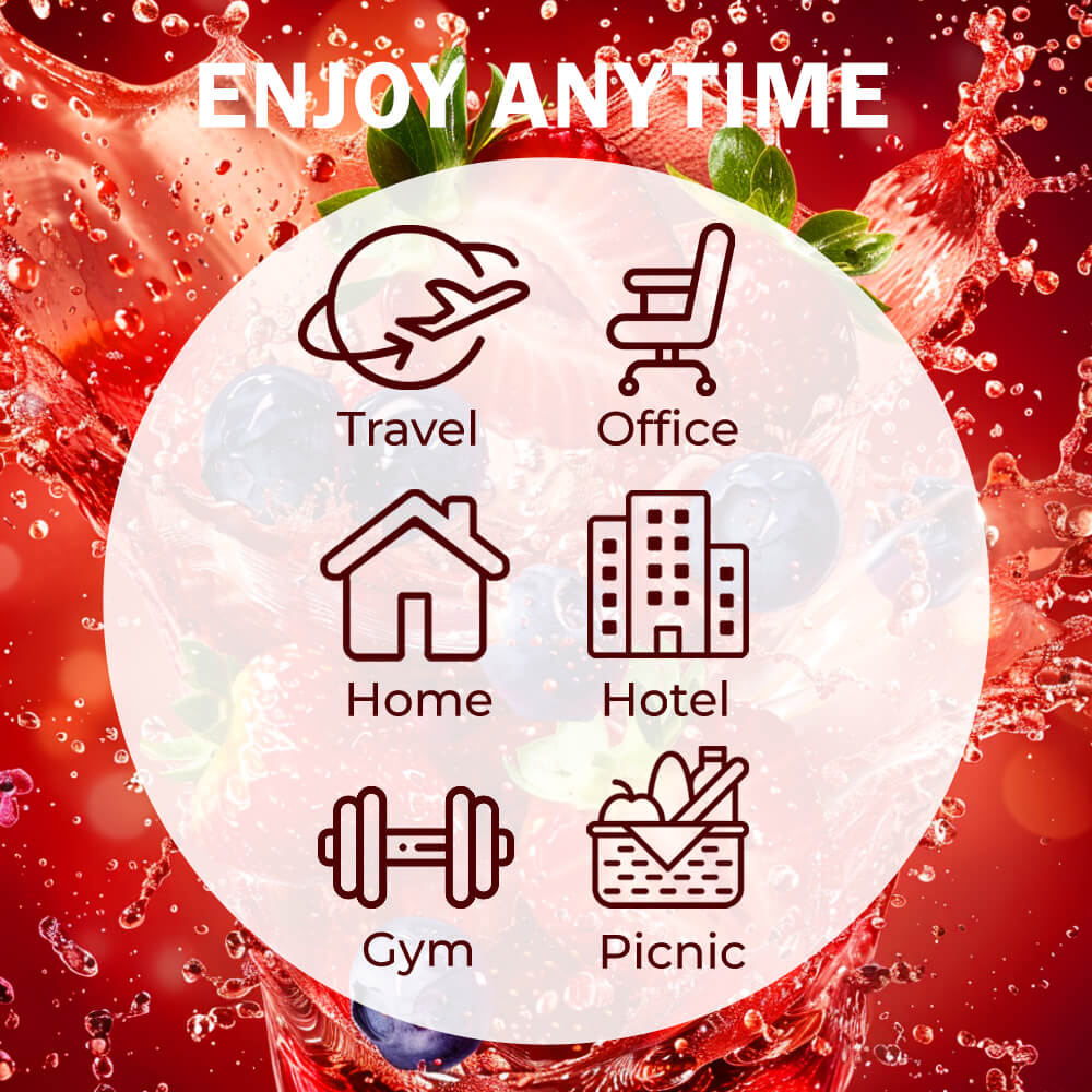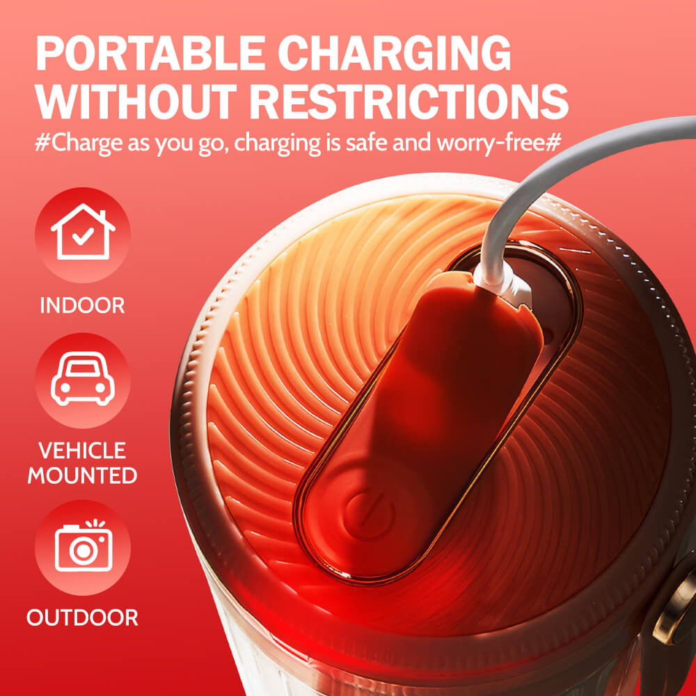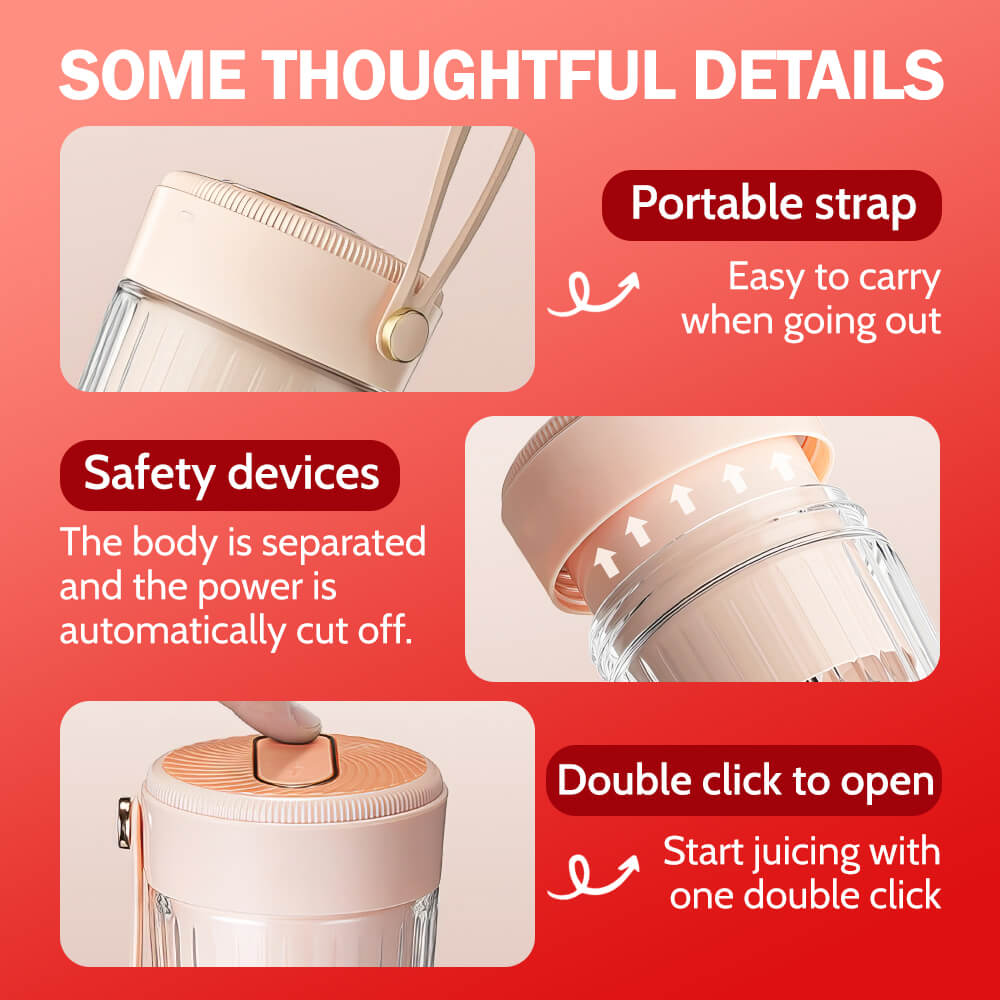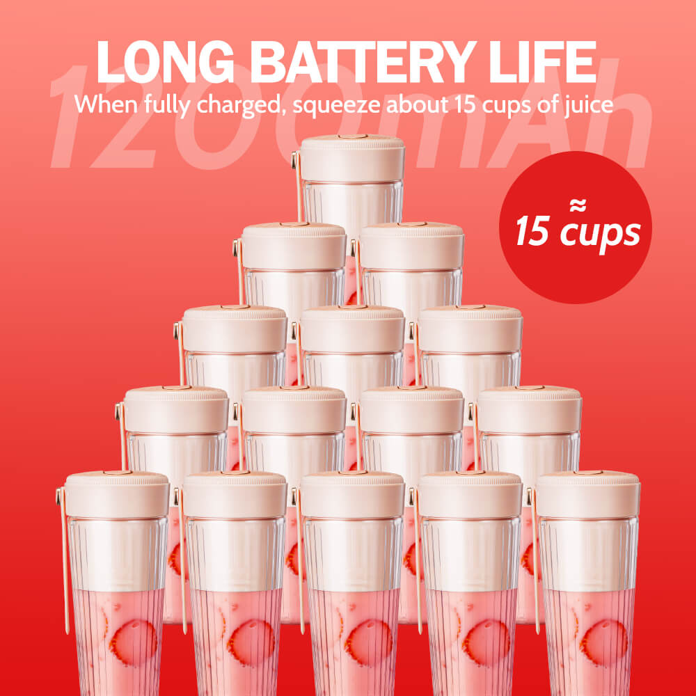 This compact blender includes a 1,200mAh rechargeable battery that supports up to 15 blending cycles per charge. It uses a USB Type-C port for easy recharging from a power bank, computer, or adapter. The safety lock system includes a double-tap start and automatic shutoff for secure operation. A built-in silicone strap makes it easy to carry to work, the gym, or while traveling.